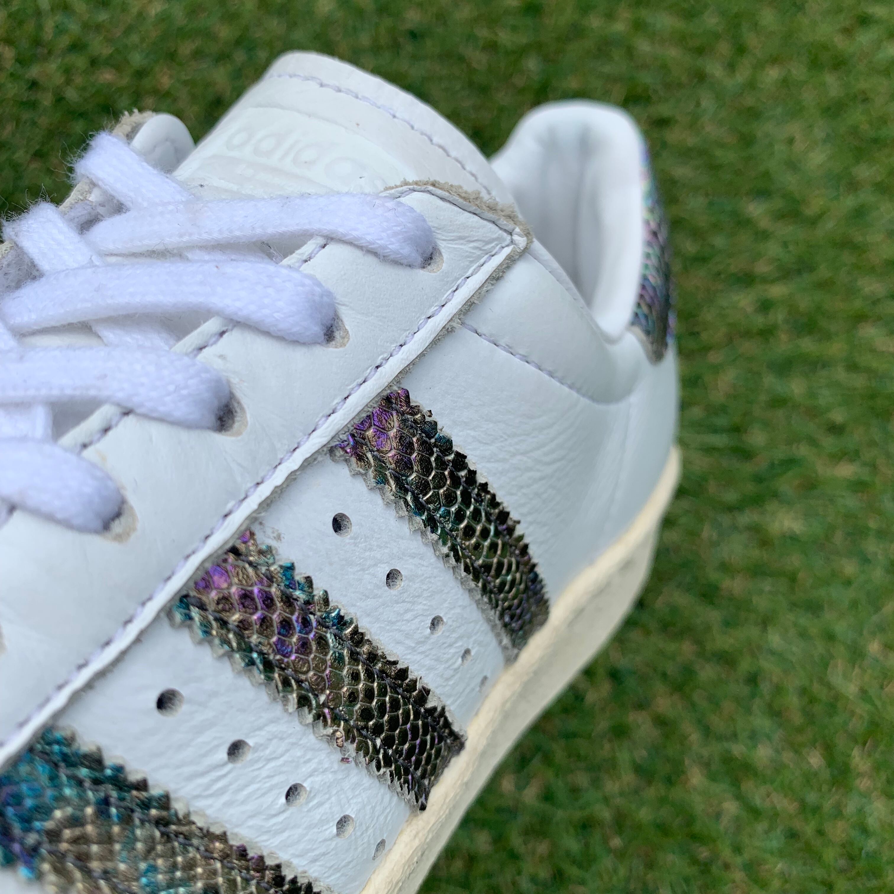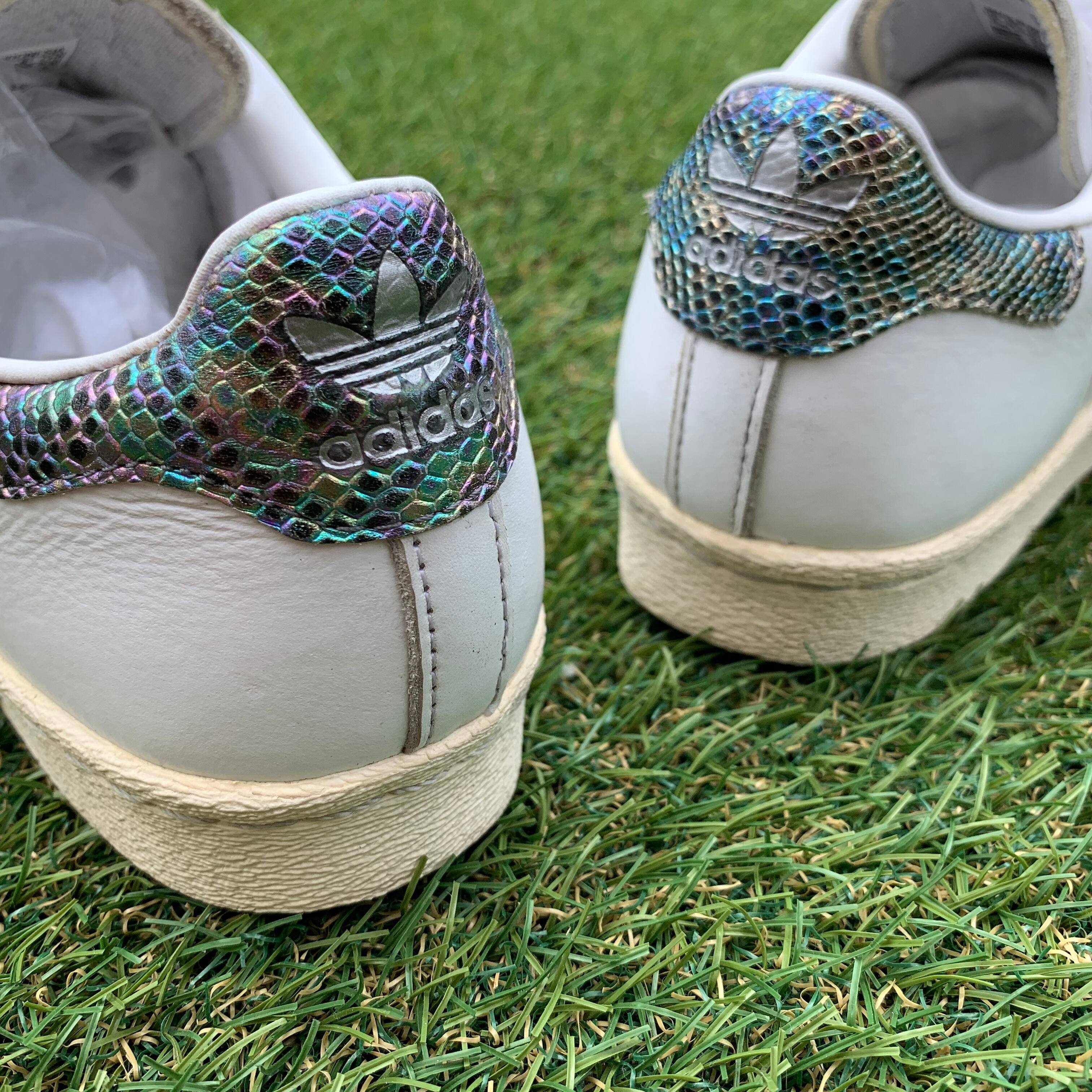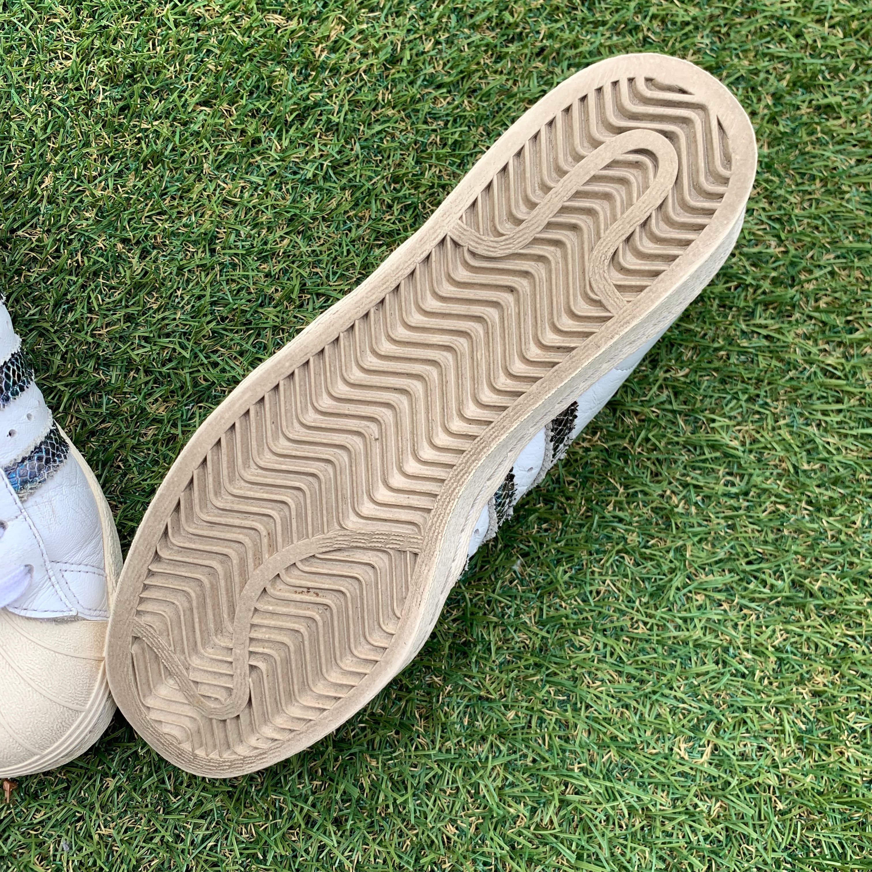 このモデルは、天然皮革製アッパーを用いたクラシックなルックスで、スネークスキン風にエンボス加工したレザーのスリーストライプスとヒールパッチをあしらって、贅沢な見た目と雰囲気に仕上げています。その他のディテールは、オリジナルモデルの仕様になっています。