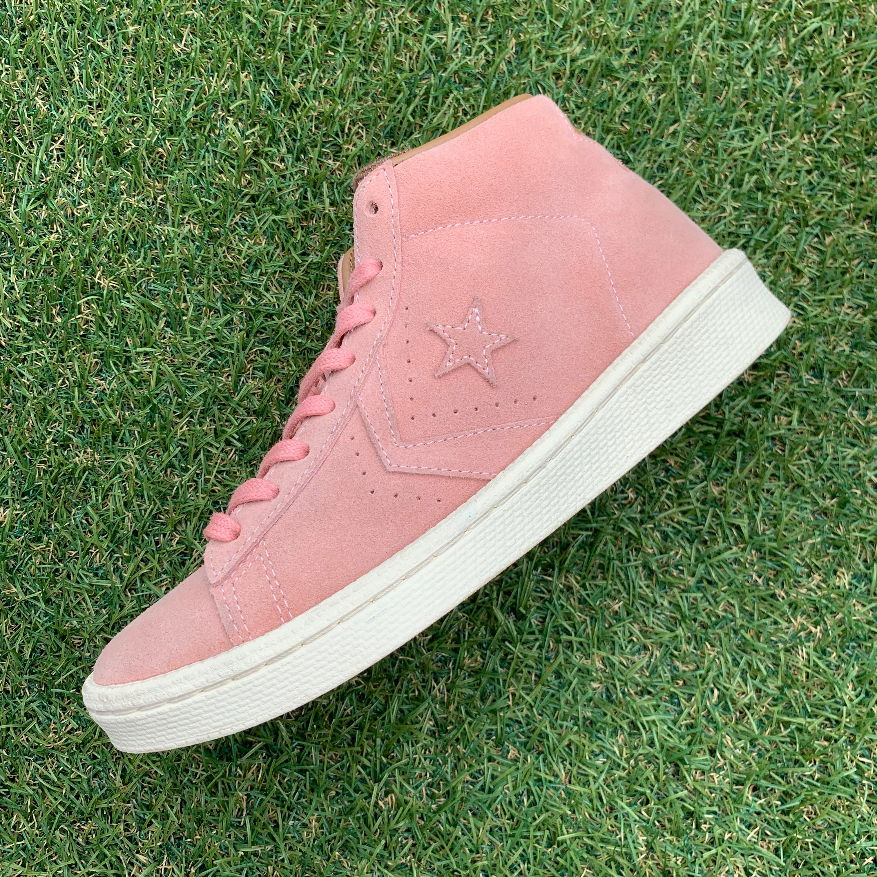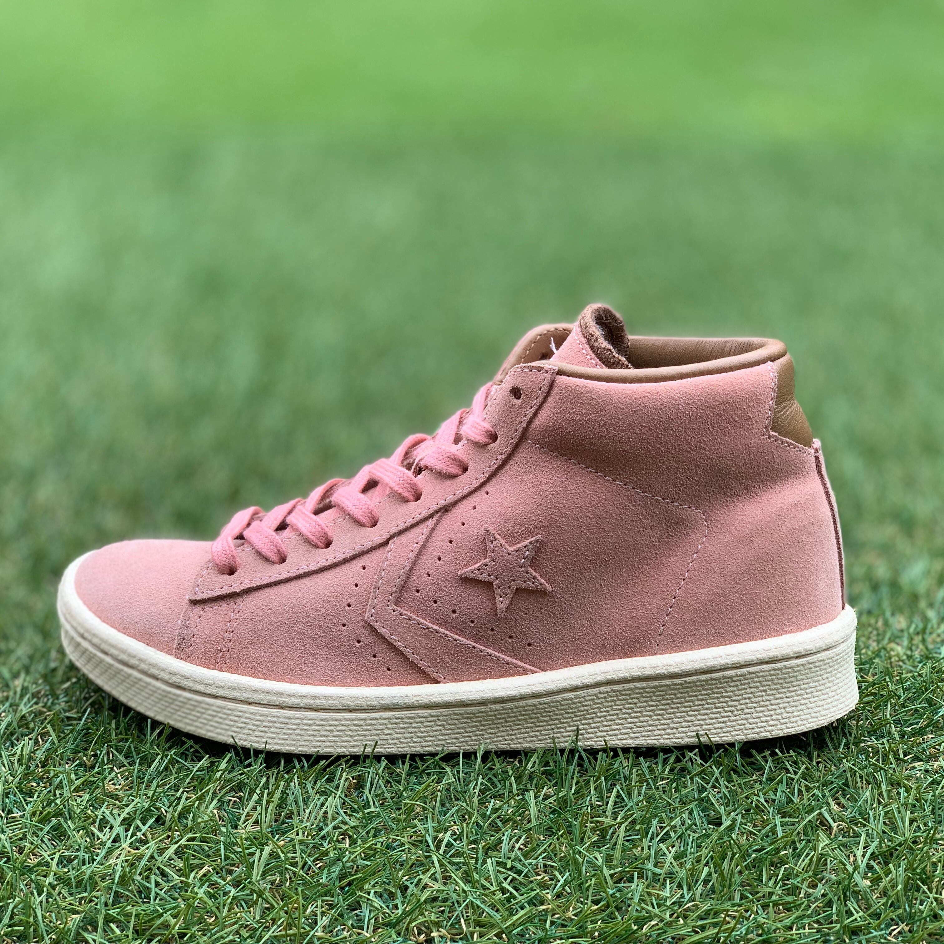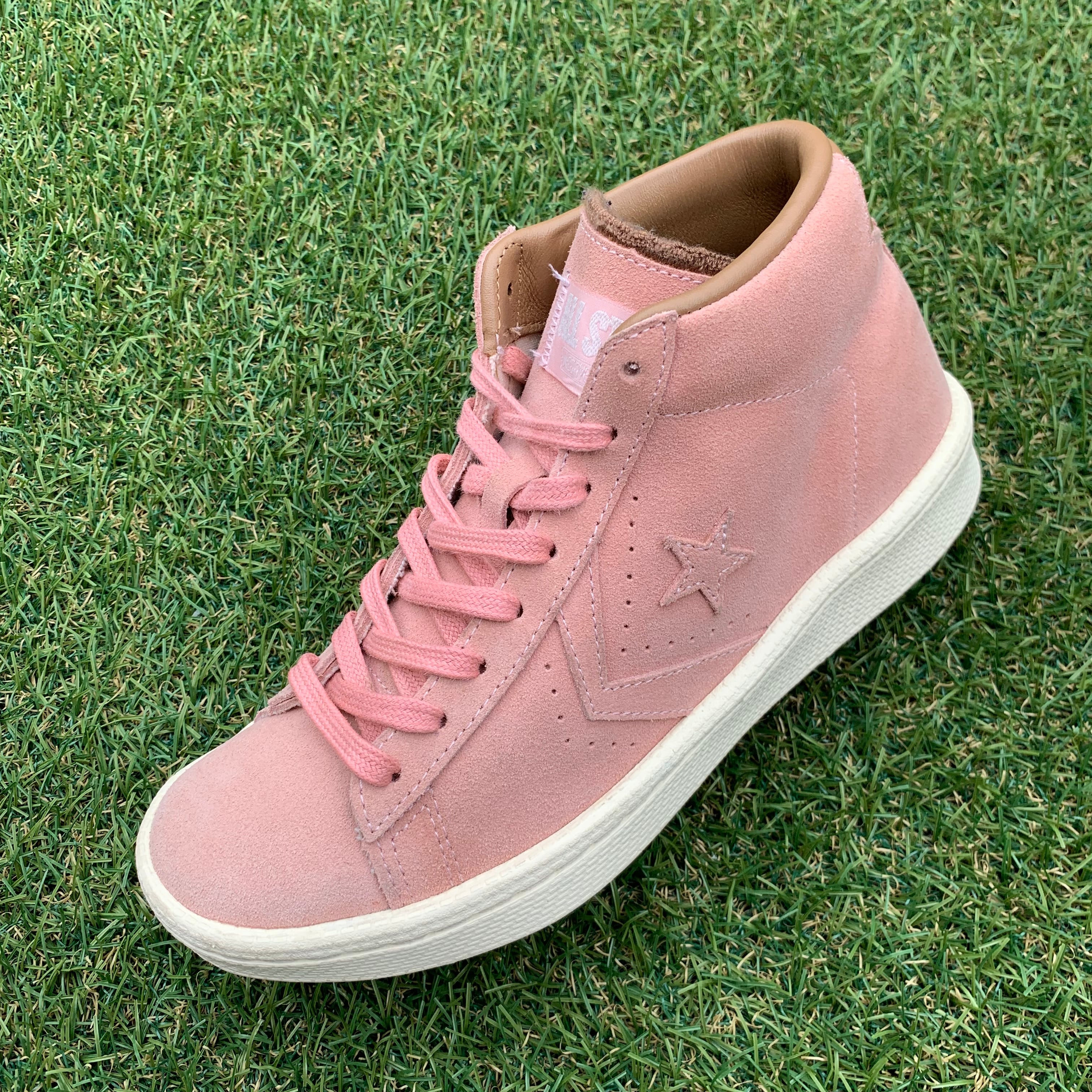 ミッドカットにスムースなスエード素材を採用し、淡いピンクでアッパーに採用しています。。インソールにはゴールドのロゴが刻印され、アッパーと同色のシューレースが統一感があります。