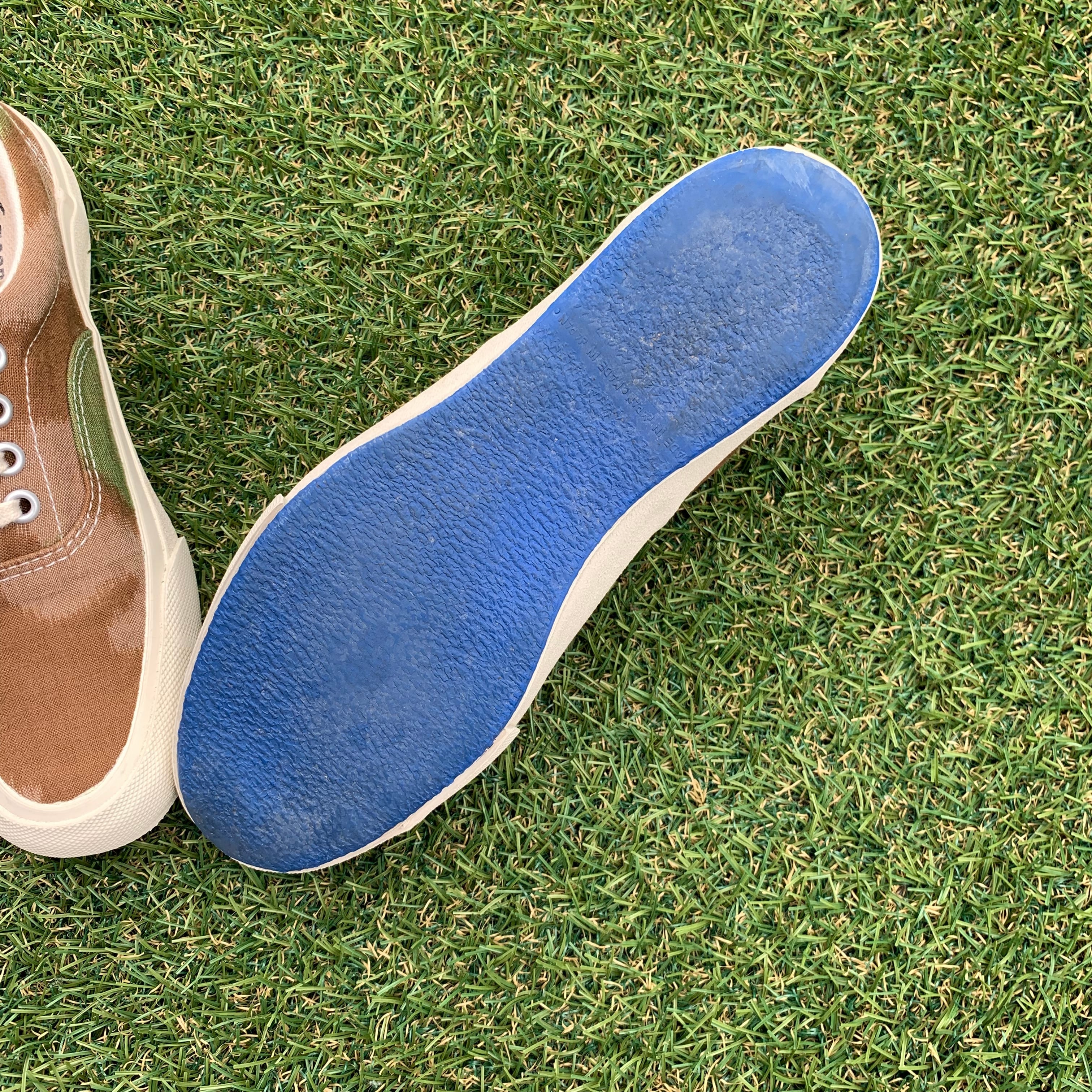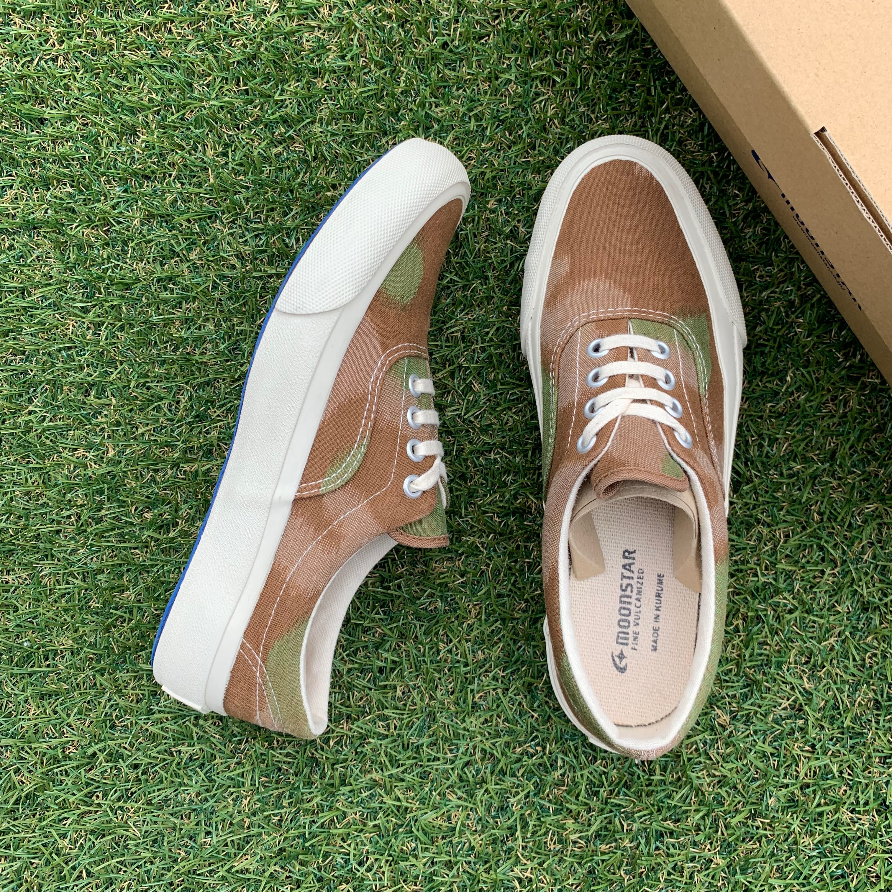 このモデルは、素材に福岡県久留米市の特産品である久留米絣を使用し、生地づくりから靴づくりまでの全てを久留米で行っているこだわりの一足です。