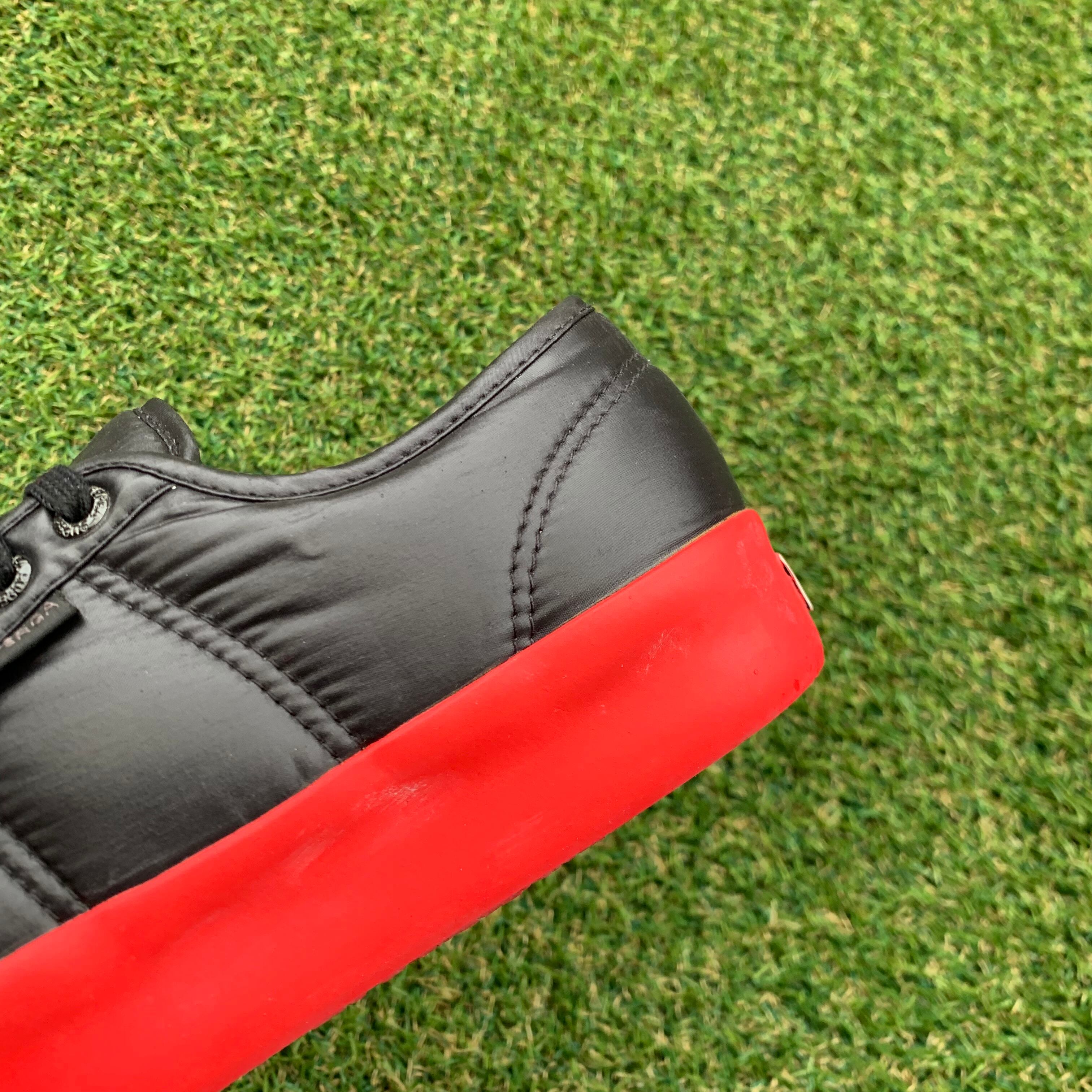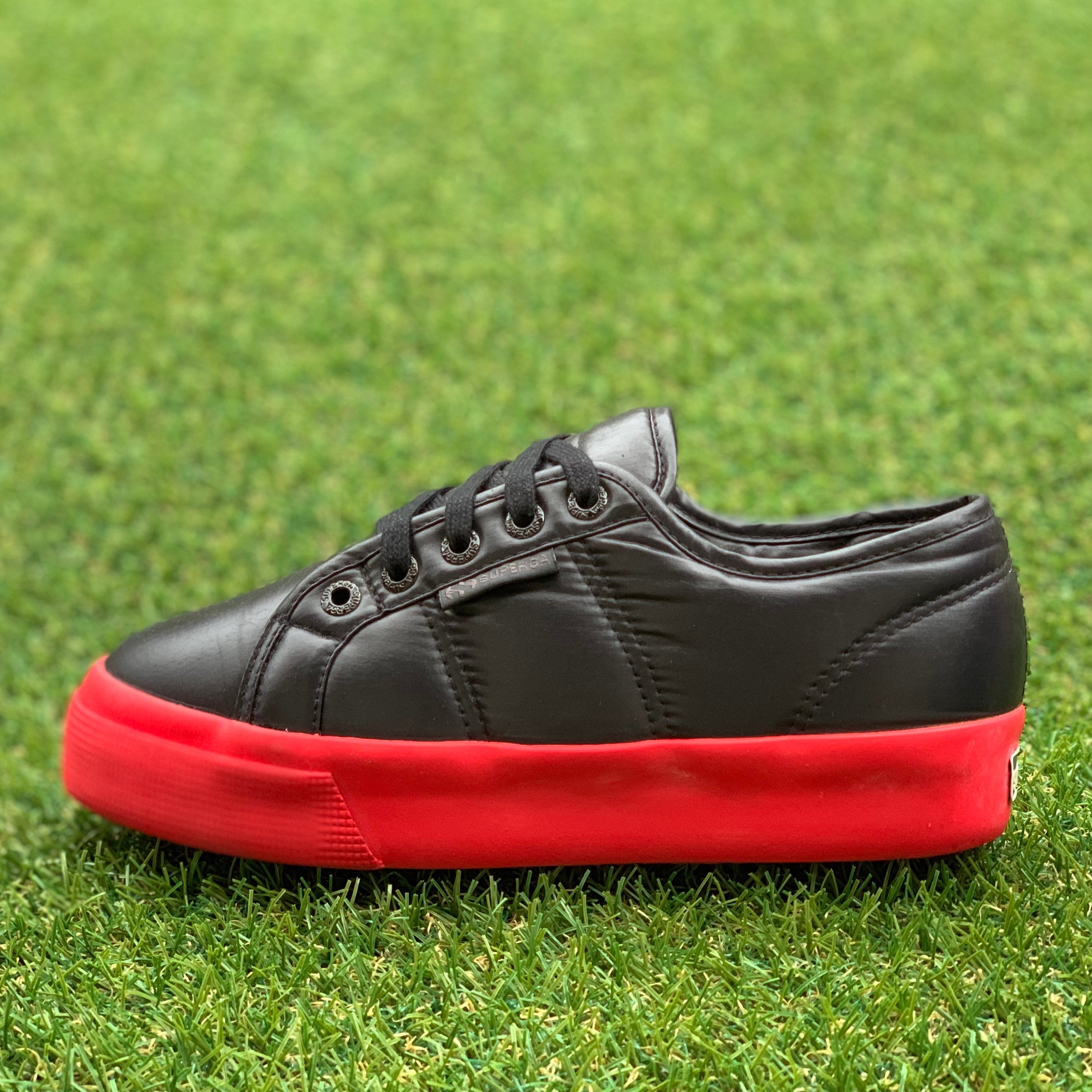 SUPERGAにはめずらしい光沢のあるナイロンアッパーの素材にレッドソールが新鮮なデザインになっています。