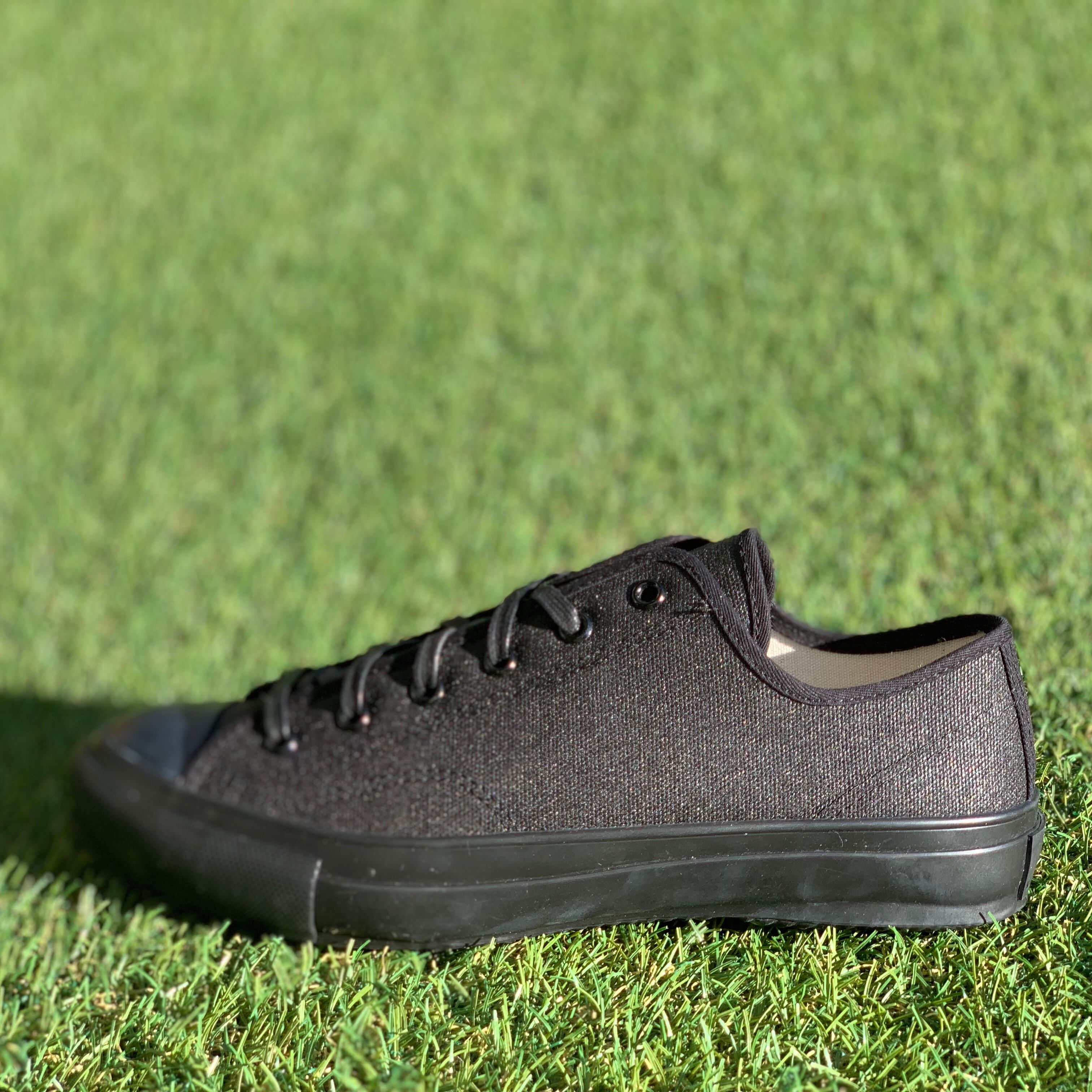 これまでの別注スニーカーは10/8オックスを使用していましたが、今回はその生地に「PARAVUL COAT (パラヴァルコート)」を施した生地を採用していて、コーティングを施すことで耐久性がアップすることはもちろん、多少の雨はしみにくくなっています。また、雨の日にも滑りにくいヘリンボンのソールパターンを採用しグリップ力もアップしています!