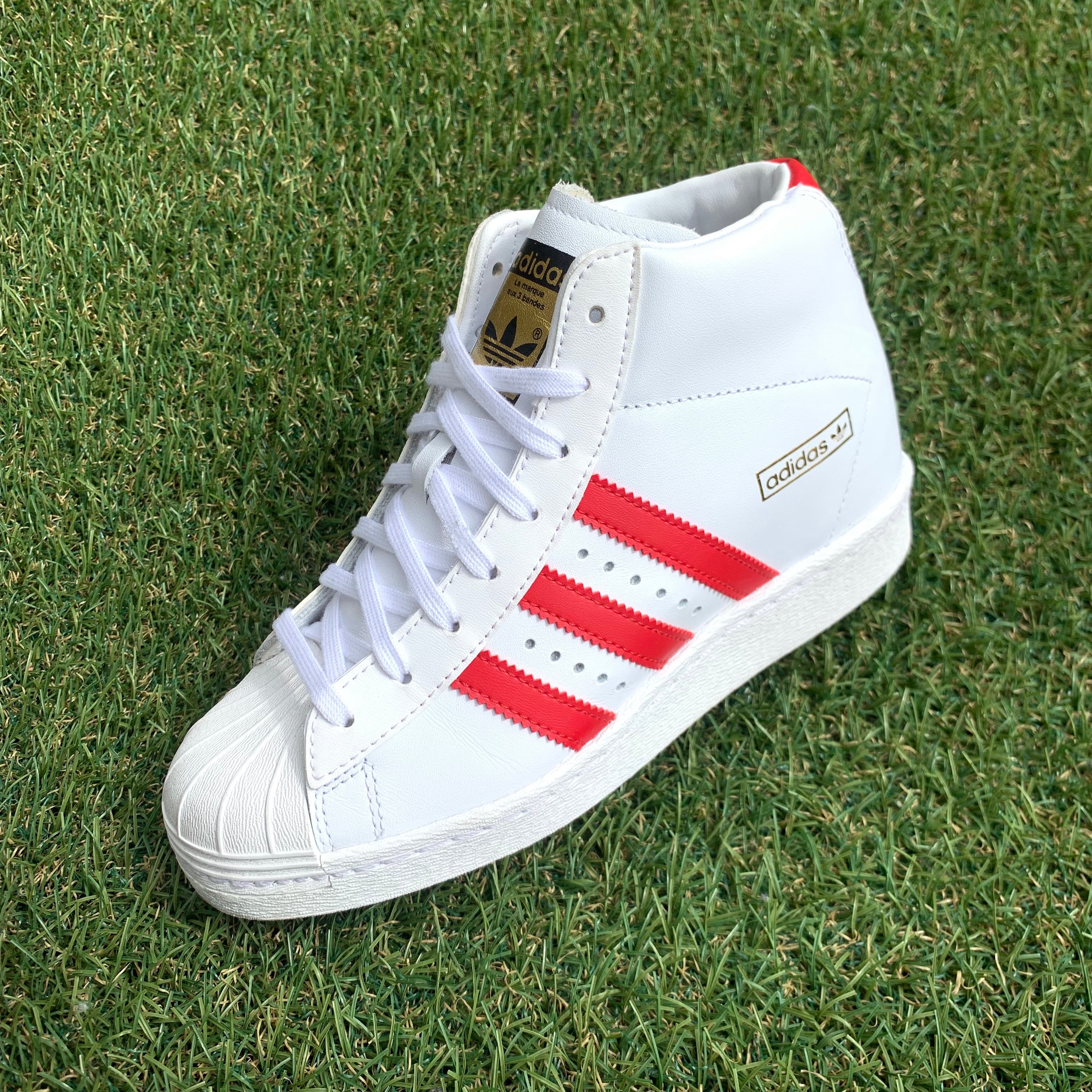 こちらのモデルは、4センチのインヒールを内蔵したモデルで、スーパースターのハイカットモデル、プロモデルに酷似したデザインです。
