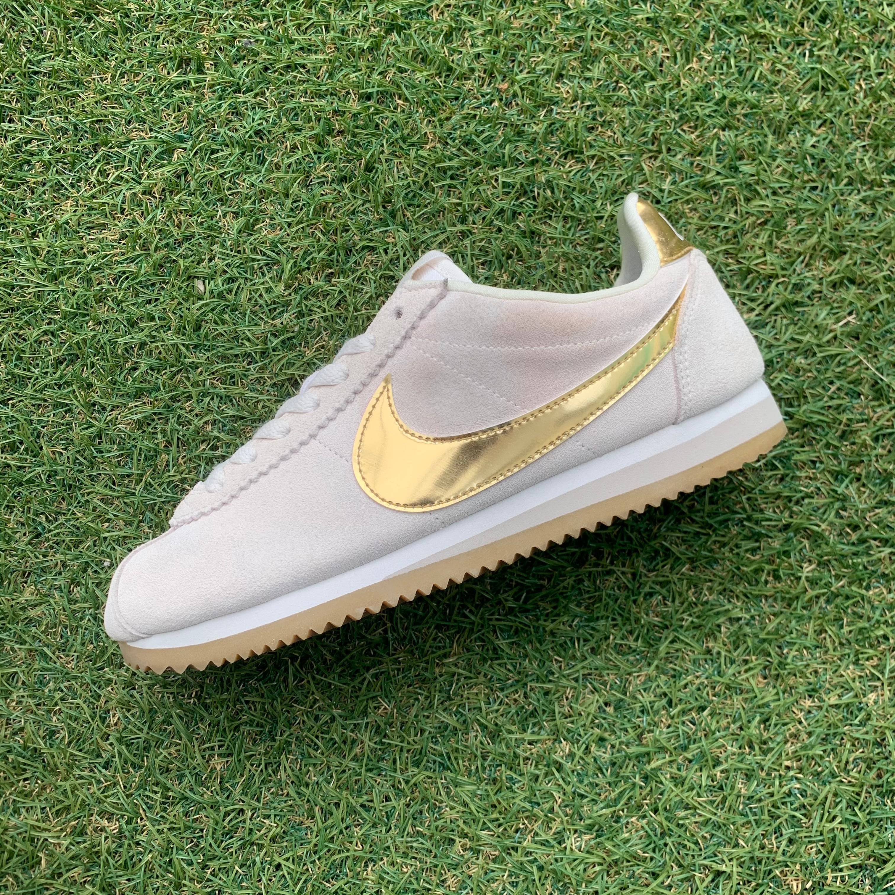 落ち着きのあるベージュカラーのスエードアッパーに、ゴールドのスウォッシュが上品な印象の一足です。