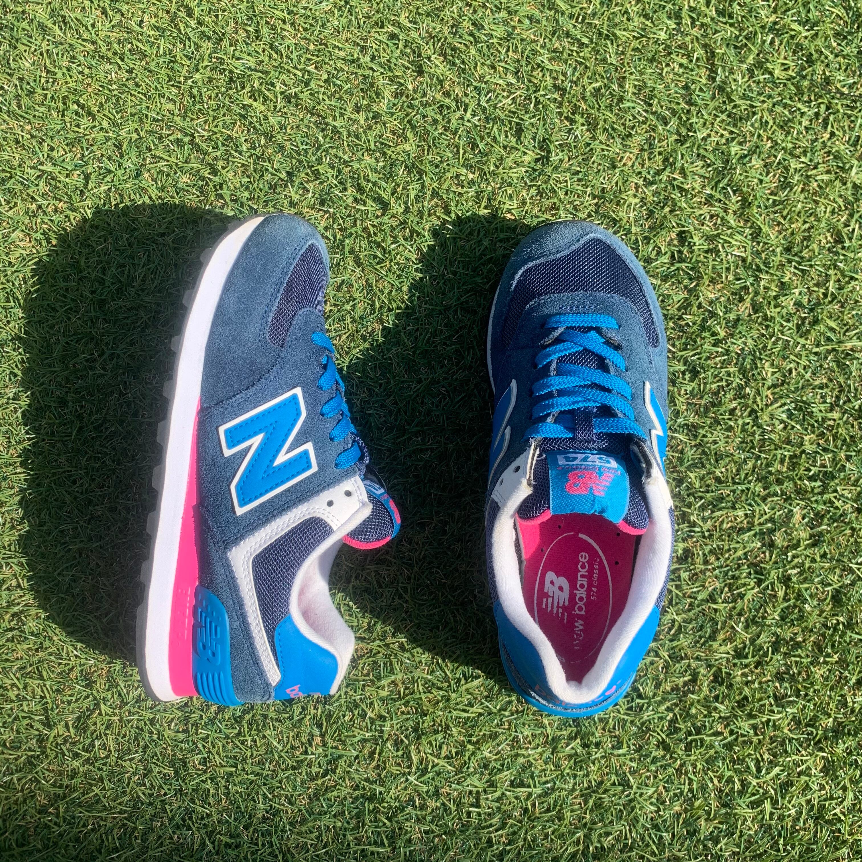 落ち着きのあるブルーカラーにピンクが差し色になったかわいいカラーリングの一足です!
